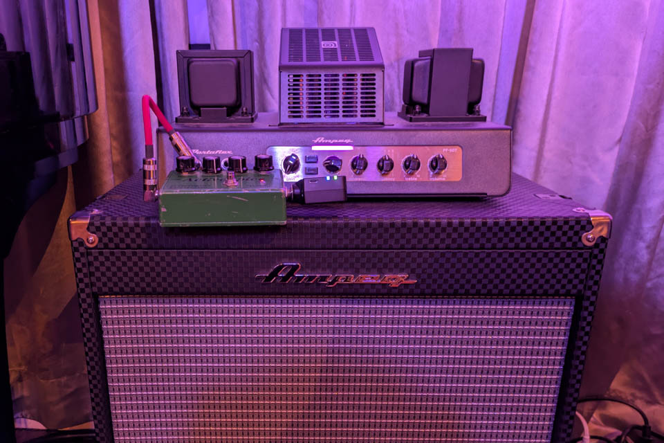 アンプはAmpegのセット。ヘッドがPF-50T、キャビネットはPF-210HEかPF-115HEでした。持ち運びのしやすさを意識したデザインのPortaflexシリーズというらしいです。中でもヘッドはオールチューブ仕様で、造形から只者ではないオーラが出ています。天面が無いのでエフェクターを載せづらかったです。