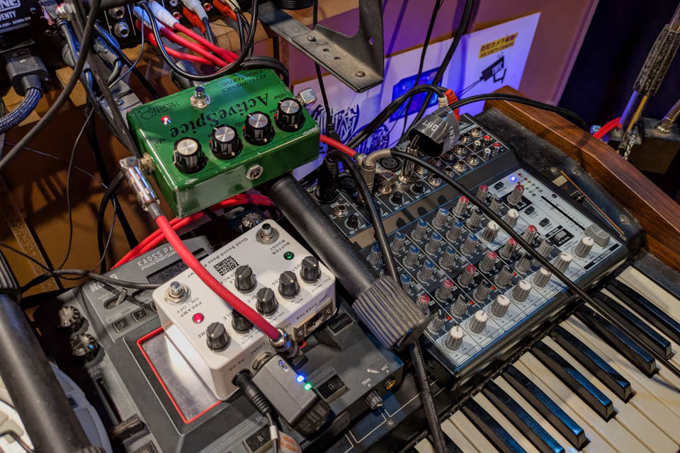とはいえサウンドの調整が全く効かないのも怖いので、ペダルエフェクターを2つ持ち込みました。Freedom Custom Guitar ResearchのQuad Sound Bass Preamp(白)と、HatenaのActiveSpice(緑)です。