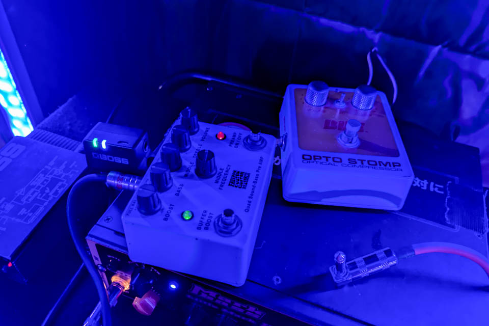 ペダルはBBE Opto Stomp(コンプ)と、Freedom Custom Guitar ResearchのQuad Sound Bass Preamp(プリアンプ)の2つ。