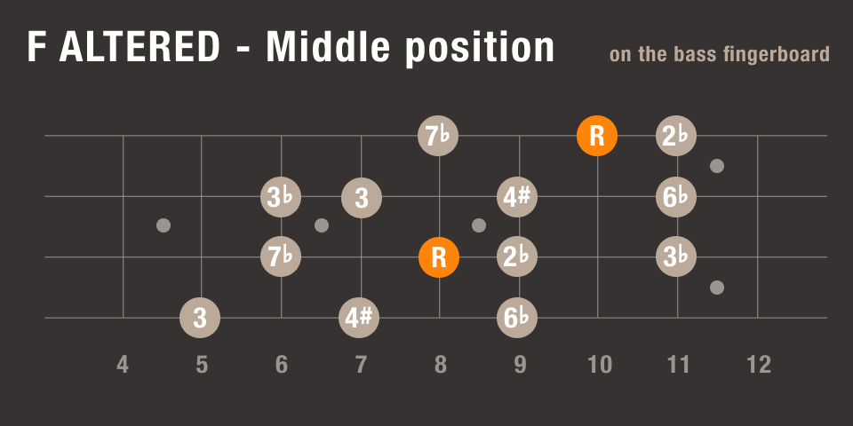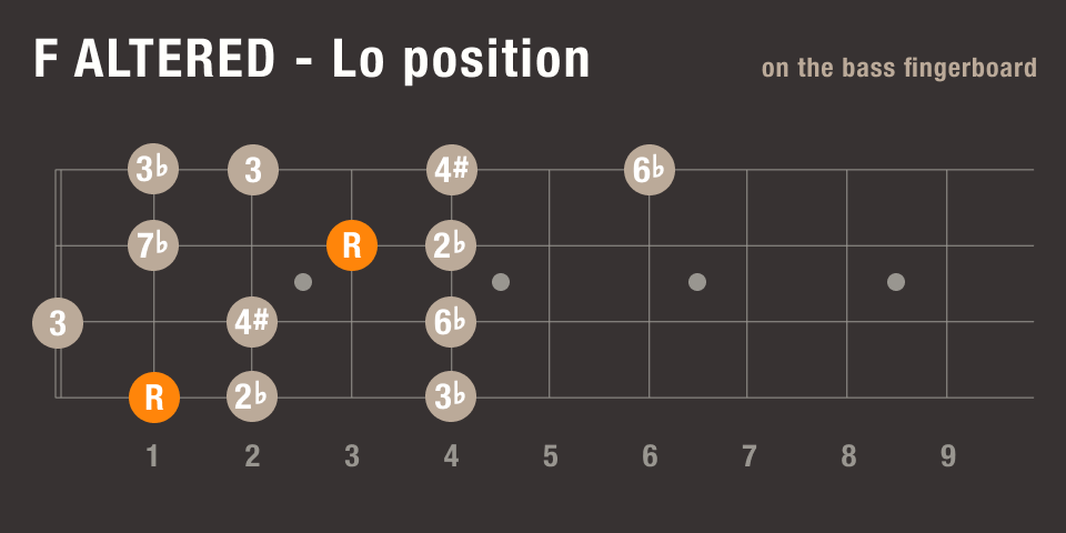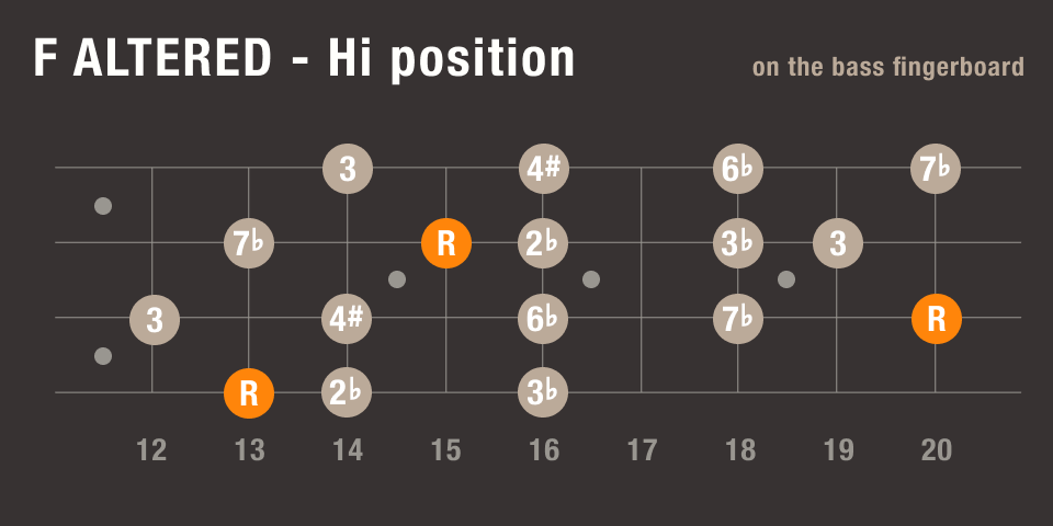 この部分、YouTubeでこの曲のベースソロ動画を見てると、Fオルタードで弾いてる人もいるようで、ポジション別の運指をここに掲載しておきます。